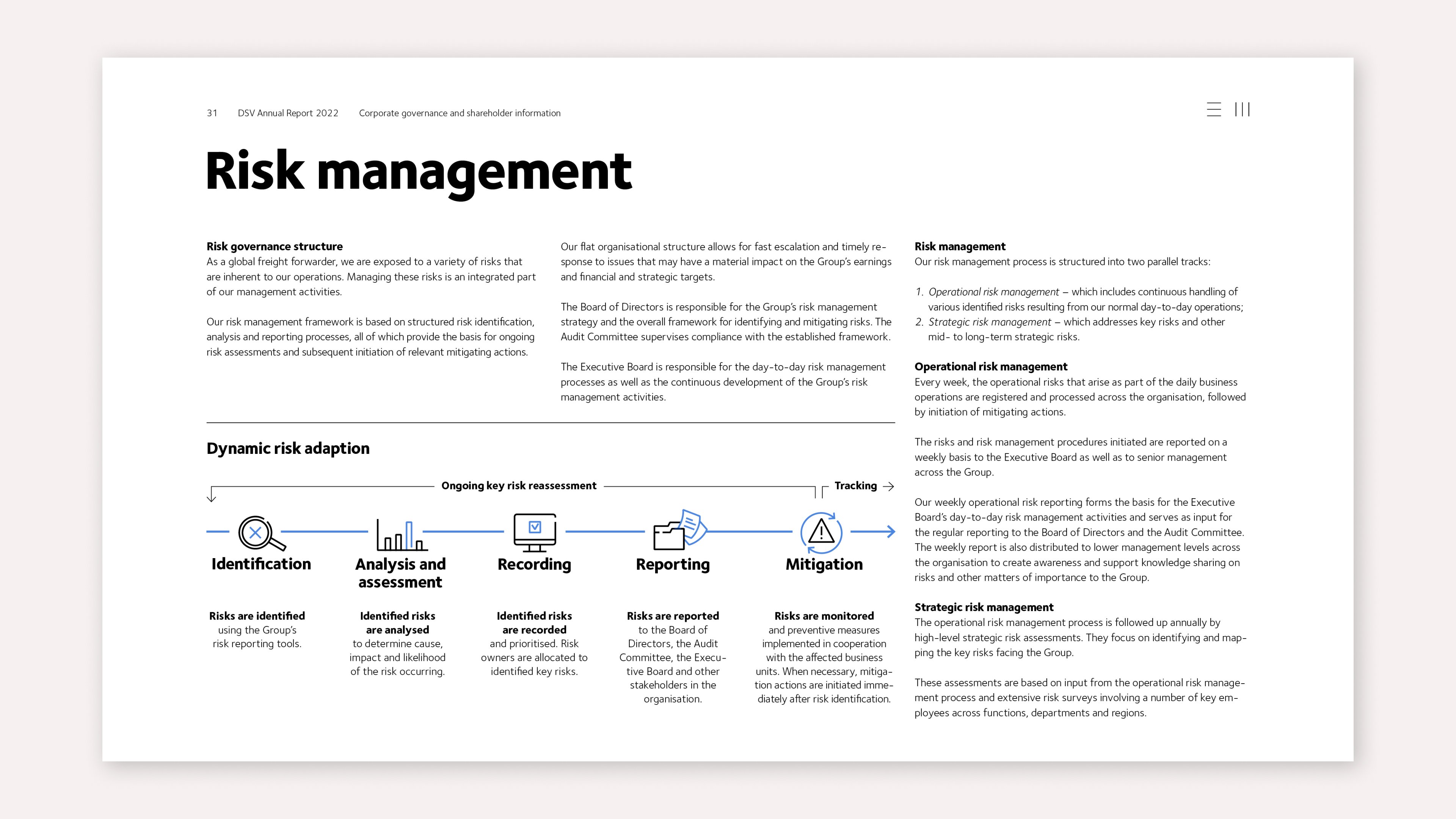 DSV is transparent in their description of risk management. It uses models for dynamic risk adaptations, key risk heat maps and overview of risk description, mitigation strategies and assessment.