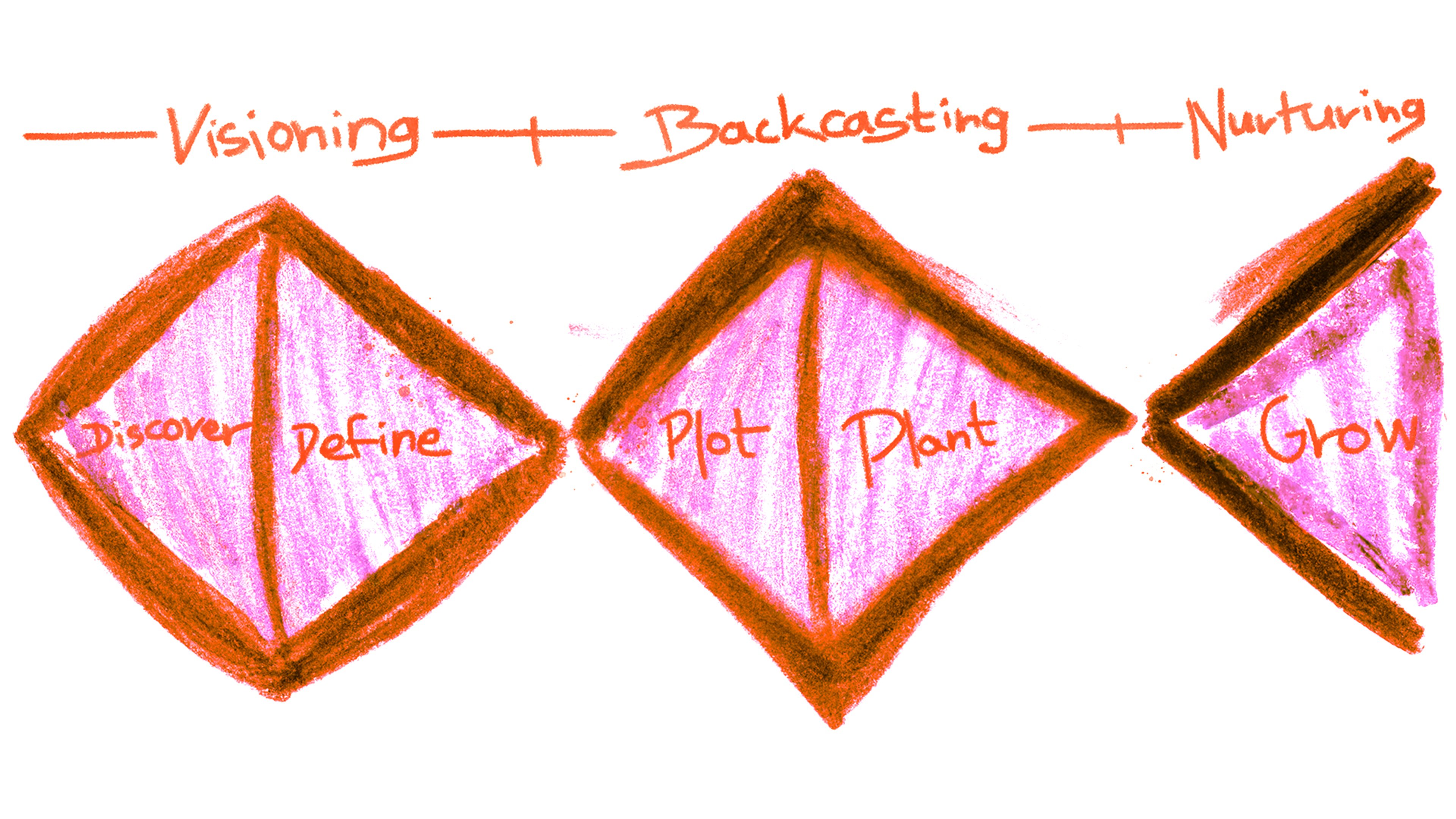 By now, the social change makers among our readers might ask: How exactly would these imaginative exercises translate into systems change? To answer this, think about gardening (stay with us!). We can think about initiatives in the present as seeds for desirable futures. These seeds might eventually flourish with enough ongoing care and response to external events such as extreme weather. Like a flower, seeds of futures do not grow in entirely predictable ways and need ongoing care and effort, and some don’t make it at all. With this metaphor in mind, we can outline a 5-step process to operationalise Futures Design: Discover, Define, Plot, Plant and Grow.